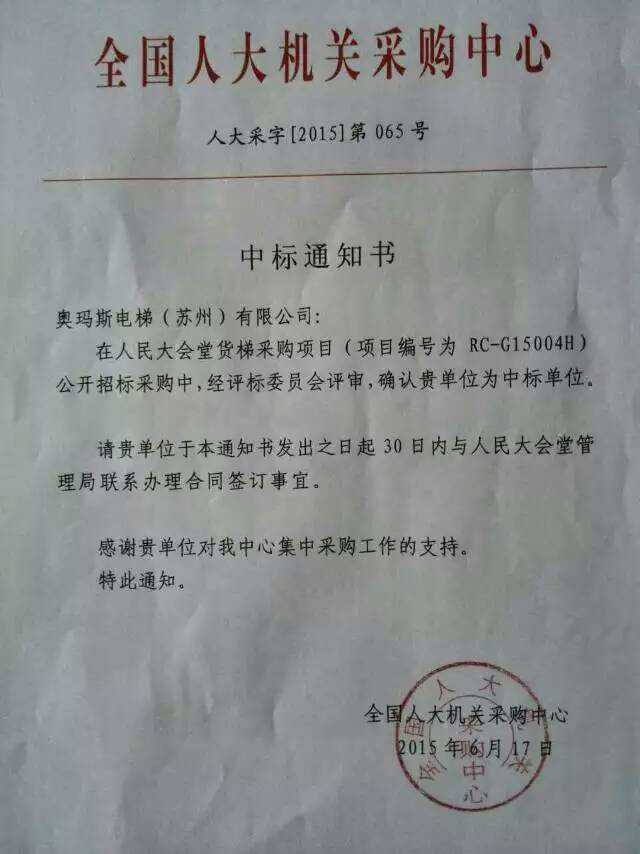 2015年6月17日,对于奥玛斯电梯公司而言这是一个鼓舞人心的好日子。我们从全国人大机关采购中心获得最终确认信息:奥玛斯电梯(苏州)有限公司在北京人民大会堂1台4000KG,1.0M/S,5层站载货电梯(项目编号为:RC-G15004H)的公开招投标活动中一举获胜,成功中标 (详见”中标通知书”) 。