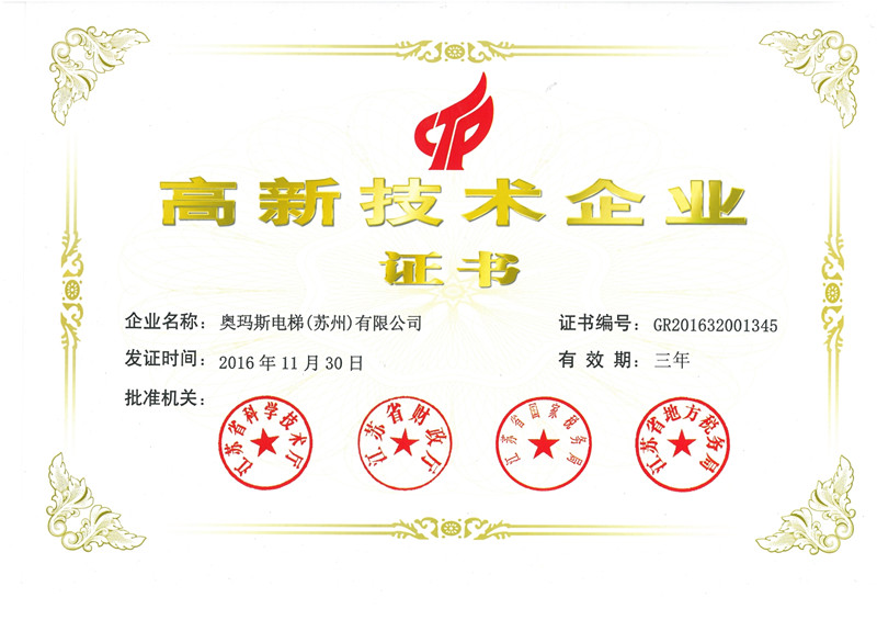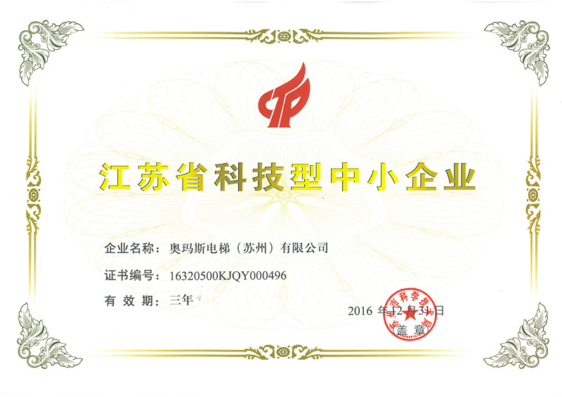 在残酷的电梯市场竞争中,我司每年持续拿出资金用于新产品的研发及现有产品的持续优化改进,使得奥玛斯的产品“性价比”更高,在我司的产品上保持了“人有我新、人无我有”的创新特色,赢得了广大客户的信任与好评。同时我司也十分注重技术成果的专利申请与保护工作。一系列的付出、持续的付出必将赢得回报,我们先后获得了“江苏省高新技术企业”、“江苏省科技型中小企业”等荣誉证书。