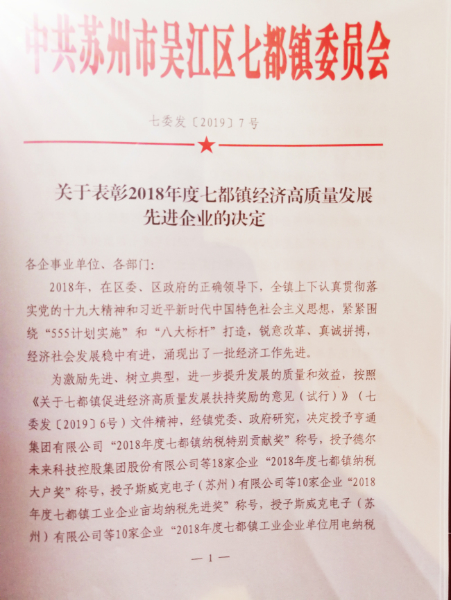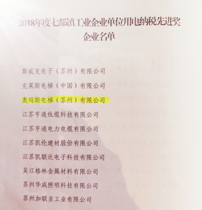 2019年2月14日,猪年初十,情人节。下午2:00时分,公司潘伟荣总经理从开会现场传来喜讯:万象城平台,万象城(中国)一站式服务平台荣获“2018年度吴江七都镇单位用电纳税先进奖” (见下列获奖名单及奖牌) 及“2018度年吴江七都镇单位纳税百强企业”的殊荣。这种荣誉,奥玛斯公司连续保持了4年。