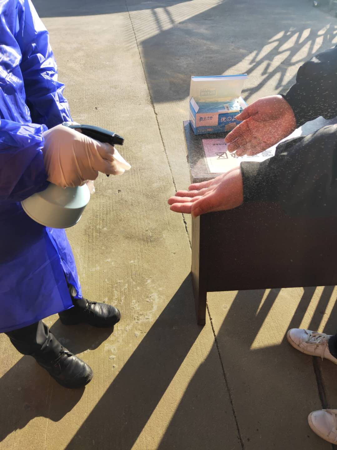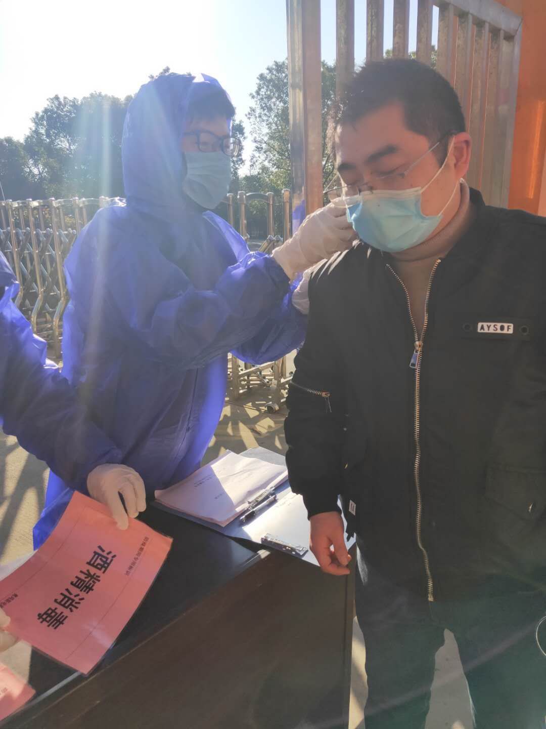 2020年2月18日,一个阳光明媚的日子。历经前期的精心准备,奥玛斯公司迎来了初批22名复工员工的到来。按照““新冠肺炎防控预案细则”要求,所有进入厂区的员工都得经过严格的体温监测、领取一次性医用口罩等环节,并经确认符合要求后才准入(见下图所示)。